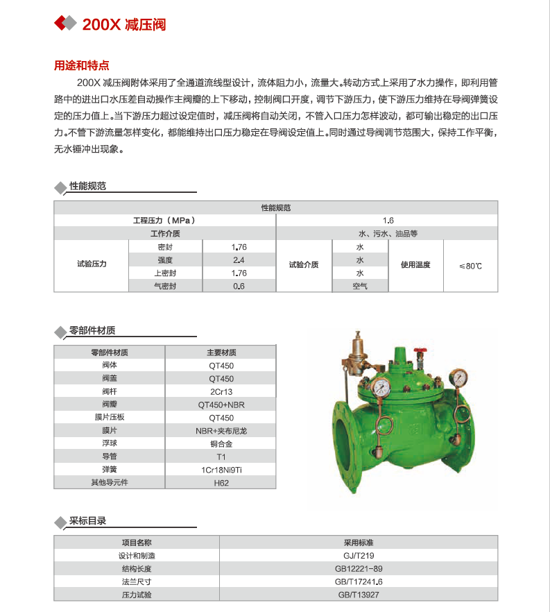 200X減壓閥附體采用了全通道流線型設(shè)計(jì),流體阻力小,流量大。轉(zhuǎn)動(dòng)方式上采用了水力操作,即利用管路中的進(jìn)出口水壓差自動(dòng)操作主閥瓣的上下移動(dòng),控制閥口開度,調(diào)節(jié)下游壓力,使下游壓力維持在導(dǎo)閥彈簧設(shè)定的壓力值上。當(dāng)下游壓力超過設(shè)定值時(shí),減壓閥將自動(dòng)關(guān)閉,不管入口壓力怎樣波動(dòng),都可輸出穩(wěn)定的出口壓力。不管下游流量怎樣變化,都能維持出口壓力穩(wěn)定在導(dǎo)閥設(shè)定值上。同時(shí)通過導(dǎo)閥調(diào)節(jié)范圍大,保持工作平衡,無(wú)水錘沖出現(xiàn)象。